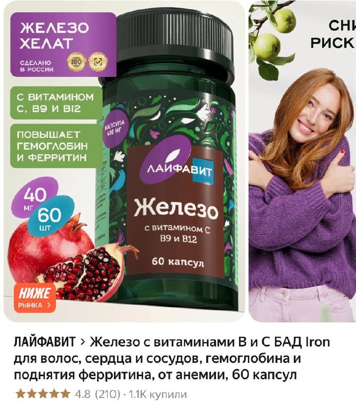 😄😪😴 Железо с витаминами В и С БАД Iron для волос, сердца и сосудов, гемоглобина и поднятия ферритина, от анемии, 60 капсул https://market.yandex.ru/cc/8JGcdB 🛍DEC122-AF — скидка 100 ₽ на один любой заказ от 5000 ₽ ✅ Канал по скидкам 🔣 Бот с промокодами