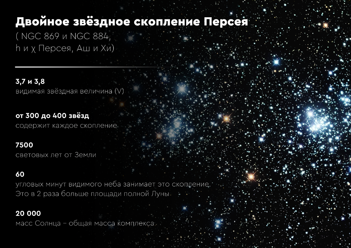 Как его найти? Нет, это проще простого. Осенними и зимними вечерами высоко над восточным горизонтом висит узнаваемая латинская буква «W» Кассиопеи. Проведите мысленную линию от её средней звезды (Нави (γ Cas)) к самой яркой звезде Персея — Мирфаку. Примерно на полпути вы и наткнётесь на это сокровище. Оно — прямо в Млечном Пути, в том самом месте, где кажется, будто звёздная река чуть расширяется и начинает мерцать чуть ярче.