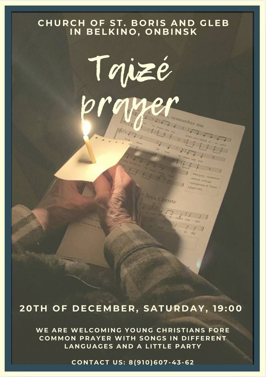 Boris and Gleb in Belkino, Obninsk! When: 20th December, Saturday, 19:00 Where: Church of St. Boris and Gleb in Belkino, 70, Borisoglebskaya street, Obninsk Special prayer for young Christians from all the denominations with songs on different languages, prayer in silence, and candles 🕯️ Prayer will be followed by little party with tea and snacks. It’s a good opportunity to meet new friends! Also we will tell you a little bit about Taizé Community. Contact us in WhatsApp or Telegram: 89106074362 (Egor) 👍 Подписаться | Ваша реклама