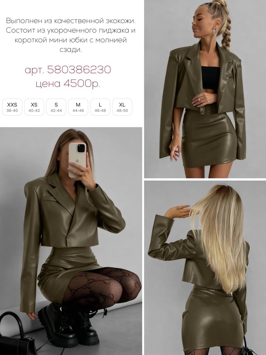 Артикул 580386230 — костюм из экокожи: укороченный пиджак и мини-юбка на молнии