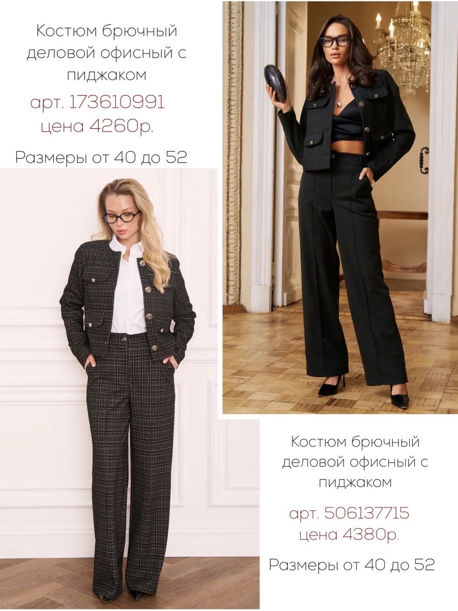 Иногда достаточно одного правильного костюма, чтобы день сложился иначе: осанка становится ровнее, шаг — увереннее, а настроение — собранным. Брючный комплект хорош тем, что он решает сразу три задачи: формирует силуэт, задаёт статус и экономит время на сборы. На фото — пять вариантов, где каждая деталь работает на образ: от линии плеч до пуговиц и посадки брюк. Ниже — разбор каждой находки строго по порядку, с артикулами и стилистическими подсказками.