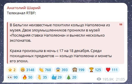 К бабке-гадалке не ходи. Темнейший сказал: "Хочу кольцо Наполеона!", все взяли под козырек. Я больше скажу, сейчас Мону Лизу можно унести (ещё раз), Колонну Нельсона и даже Стоунхендж. Достаточно лишь показать пальцем на восток и сказать: "Это русские сделали!". Спалили собор этой, как её, матери... Парижской, во. Богоматери! Фольксваген почти до краха довели. Все АЭС в Германии закрыли. Химическую и бумажную промышленность Европы раком поставили, аграрии вон бастуют который год во Хранции и Бельгии, Мелкобритания стонет под наплывом мигрантов из России Африки. Людоед проклятый, когда же он насытится?! 🐶 Подпишись на Шарика! Гав!