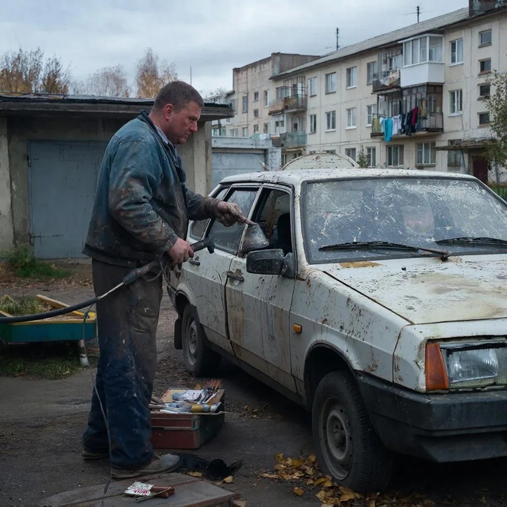 Весь день он готовил. Зачищал, шпаклевал, грунтовал. Руки нашли дело — и успокоились. Мысли тоже. Была только поверхность, которую нужно сделать идеальной. Он не красил из баллончика. Он нашёл старый, но работающий краскопульт в гараже, развёл акрил, отрегулировал давление. Красил в три слоя, с промежуточной сушкой. Когда снял плёнку с фар, сосед свистнул.