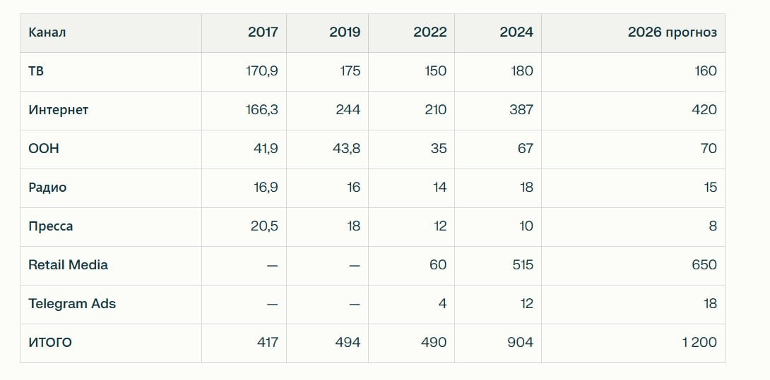 Он не просто показывает трансформацию рынка и падение старых медиа, но и показывает куда более страшную тенденцию 2026 года - вероятное пропадание госзаказа, который сегодня составляет минимум 30% всех рекламных бюджетов (не считая грантов). Аналитики с ужасом смотрят в 2026й... из хороших новостей - есть некий ассортимент - 3 варианта исхода событий. От Google к Госзаказу: как российский рекламный рынок прошёл путь от 417 млрд до 1,3 трлн рублей — и почему это катастрофа для бизнеса. AdeQQvat провёл детальный разбор 2017–2026 годов. Вот что скрывается за красивыми цифрами роста. Публикация познавательна для всех - информации очень много, интересна выделенная динамика от 2017 к 2025 и прогнозам на 2026. РАДИО, как рекламной площадке, в будущем места не отведено. 2017. Индекс: 100 (“почти идеальная база”) → 💰 Общий объем рынка (основные медиа): 417 млрд ₽ (без НДС), рост +14% к 2016. → 📺 ТВ: 170,9 млрд ₽ (+13%). → 📻 Радио: 16,9 млрд ₽ (+3%). → 🎯 Практика: стратегия “ТВ для охвата