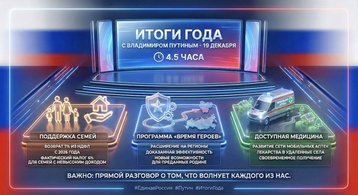 ». В течение 4,5 часов Президент отвечал на вопросы жителей нашей страны. Обсудили много важных тем, но я бы хотел(а) выделить ключевые: ✅ Поддержка семей: С 2026 года вводится классная мера — возврат 7% из уплаченного НДФЛ для семей с невысоким доходом. Фактически налог для них снизится до 6%. ✅ Программа «Время Героев»: Она доказала свою эффективность и теперь будет расширяться на регионы. Это новые возможности для тех, кто делом доказал преданность Родине. ✅ Доступная медицина: Развитие сети мобильных аптек позволит жителям даже самых удаленных сел вовремя получать нужные лекарства. Важно, что такие встречи позволяют напрямую говорить о том, что волнует каждого из нас. #ЕдинаяРоссия #Путин #ИтогиГода