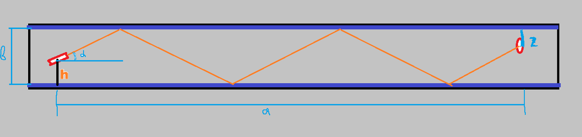 Вообще у меня много подобного рода задач в арсенале. Но самое интересное не только придумать её и решить, а правильно выстроить подход к решению. Я уже как- то в видео материале её показывал. Возможно она где-то была выложена.. Но этот вариант придумал самолично. Задача. Есть тоннель с зеркальным полом и потолком. В котором на одной плоскости вдоль тоннеля находятся лазерная пушка и мишень. Дано два условия: 1 - Точно попасть в мишень. 2- Сделать нужное количество отражений, от зеркал. Например, 4 как на картинке. НАйти или рассчитать, или построить угол альфа под которым нужно выстрелить из лазерной пушки. Это задание я давал при подготовке детей к олимпиадной физике у себя в районе. Удачи Вам.