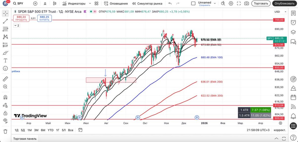 ! $SPY, $QQQ, $SMH возвращаются за все скользящие и формируют впечатляющие «молоты» на 10 EMA W = позитивно + ротационные отрасли на этой неделе показали себя хорошо, особо не реагировали на падение и продолжают удерживаться у максимумов. До закрытия рынка осталось еще 2 часа, так что будем наблюдать дальше. Новых позиций я не добавлял. Что касается $BTC, ситуация пока не меняется — выглядит печально. Он реагирует на 20 EMA D и на клин (по субъективному анализу) как на сопротивление и рисует фитиля сверху. А на быстрых скользящих обычно происходят сильные моментумы, и сейчас для него доминирует «медвежий» тренд. Я продолжаю не лезть в крипту, так как «бычьего» сетапа пока нет. Если и использую сделки, то только быстрые, когда становится скучно. Ждем Санту на следующей неделе 🎅 Всем отличных выходных! 😎 #spy #технический_анализ #америка #трейдинг_сша #фондовый_рынок #обзор #вывод #qqq #vix #smh #mags #xlk #ixic #крипта #btc