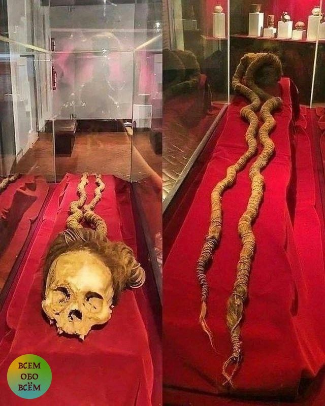 Волосы все еще прикреплены к черепу, длина кос составляет 2,8 метра. Возможно, при жизни эта женщина была жрицей.