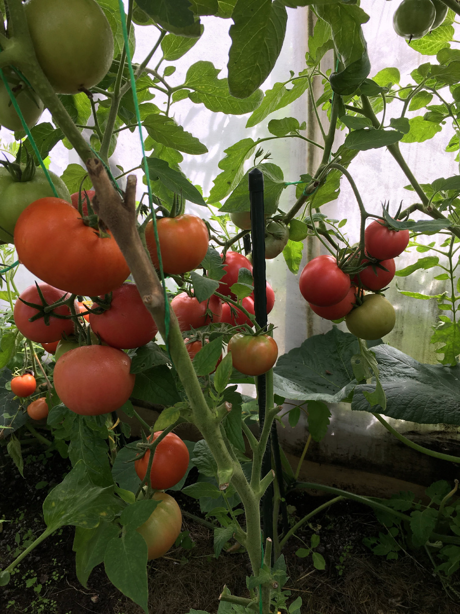 3. «Таунсвилль»- гибрид , среднеспелый. В интернете написано детерминантный, высотой 40-45см, но может вырастать до 120см. Очень размытое описание, в теплице растение выросло под потолок. Было два растения, одно посадила у входа в теплицу, формировала в два стебля, но на нем появилось всего четыре помидора. Второе растение росло в середине телицы, результат на фотографии. Что это за финт, я так и не поняла, все таки это гибрид. Плоды круглые, ровные,красные , массой 80-120 гр, некоторые больше, но насколько они похожи на оригинал сказать трудно. Вкус плода хороший, с небольшой кислинкой.