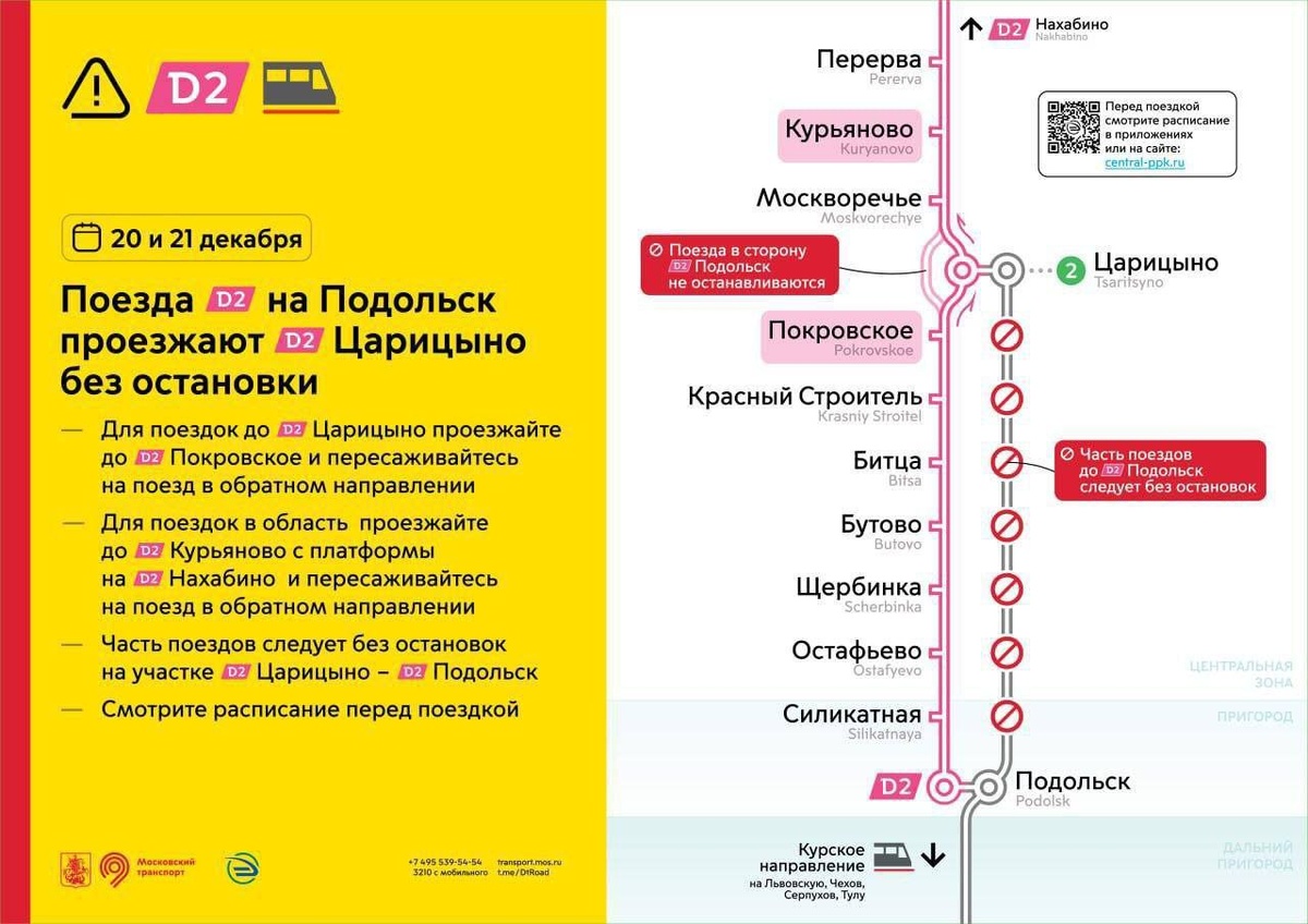 20 и 21 декабря поезда в сторону области («на Подольск») не будут останавливаться на станции Царицыно