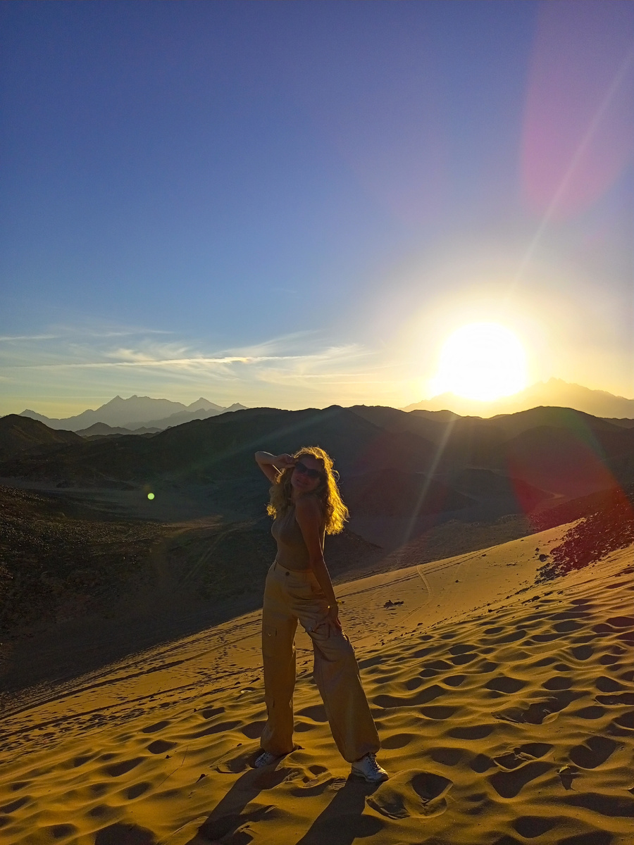 Сюда мы приехали лицезреть закат. Красота! 🤗 Ну и как же не запечатлеть себя в момент исчезающего за горами солнца?! Вместе с нами небесное светило на холме провожала группа китайцев. Они вели себя как повторюшки: первый скатился с него на попе, и все, как один последовали его примеру, скопировав сей трюк.