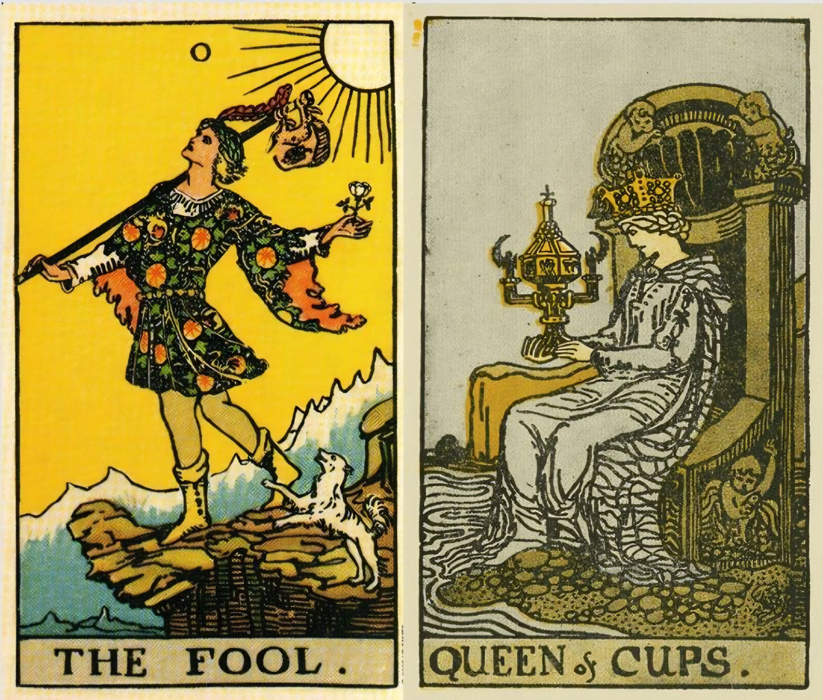 Сочетание Шута (0) и Королевы Кубков — это союз невинности и зрелой мудрости сердца.