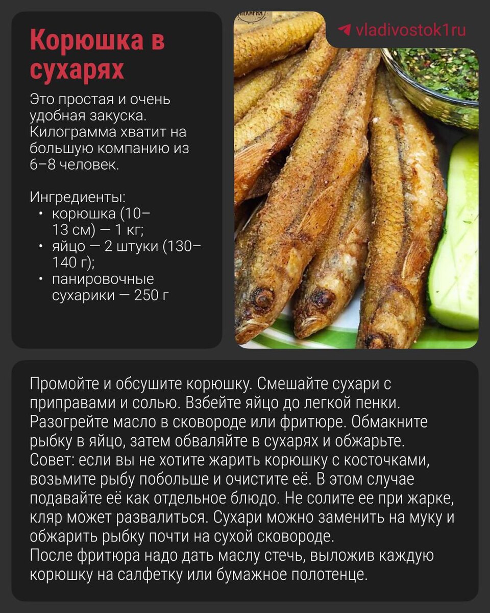 разнообразие. Новый год всё-таки бывает раз в году, и иногда можно позволить себе чуть больше фантазии, вкуса и настроения. Тем более если хочется не просто накормить гостей, а действительно их удивить. Мы в Приморье знаем толк в морепродуктах и умеем делать праздничные блюда без лишнего пафоса, но с характером. Если вы устали от стандартного меню и хотите добавить на стол что-то свежее, солёное, морское и по-настоящему новогоднее — эти идеи точно пригодятся. Да, где-то придётся раскошелиться на икру или краба, но впечатления гостей того стоят. Сохраняйте себе, берите на заметку и вдохновляйтесь: для тех, кто не знает, чем удивить гостей на Новый год, — VLADIVOSTOK1.RU сделал карточки с рецептами пяти блюд с приморским акцентом. Среди них: корюшка в хрустящих сухарях, оливье с солёной рыбой, «Мимоза» по-камчатски и другие варианты, которые украсят стол и добавят празднику дальневосточный характер. 🟥 Подписаться | Предложить новость
