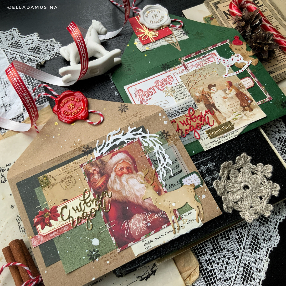 Привет-привет! С вами снова Лада Мусина . Самый любимый и ожидаемый всеми праздник - Новый год - уже совсем-совсем скоро, и поэтому нужно поторопиться с подарками родным и близким. И конечно же, не забыть об поздравительных открытках. Сегодня у меня на столе задекорированные праздничные конверты, которые с легкостью заменят новогодние открытки. И при этом смотрятся они очень эффектно. Делаются быстро - немного бумажных слоев, картинки с персонажами, имитация сургучной печати и вырубка Мимикат. В деле ножи из наборов, которые неизменно выручают меня с зимними и новогодними работами. Это наборы «Под елочкой скакал», «Мои поздравления», «Сплету венок», «Автомобиль с подарками», «Друзья детства», «Снеговик». Желаю всем праздничного настроения!