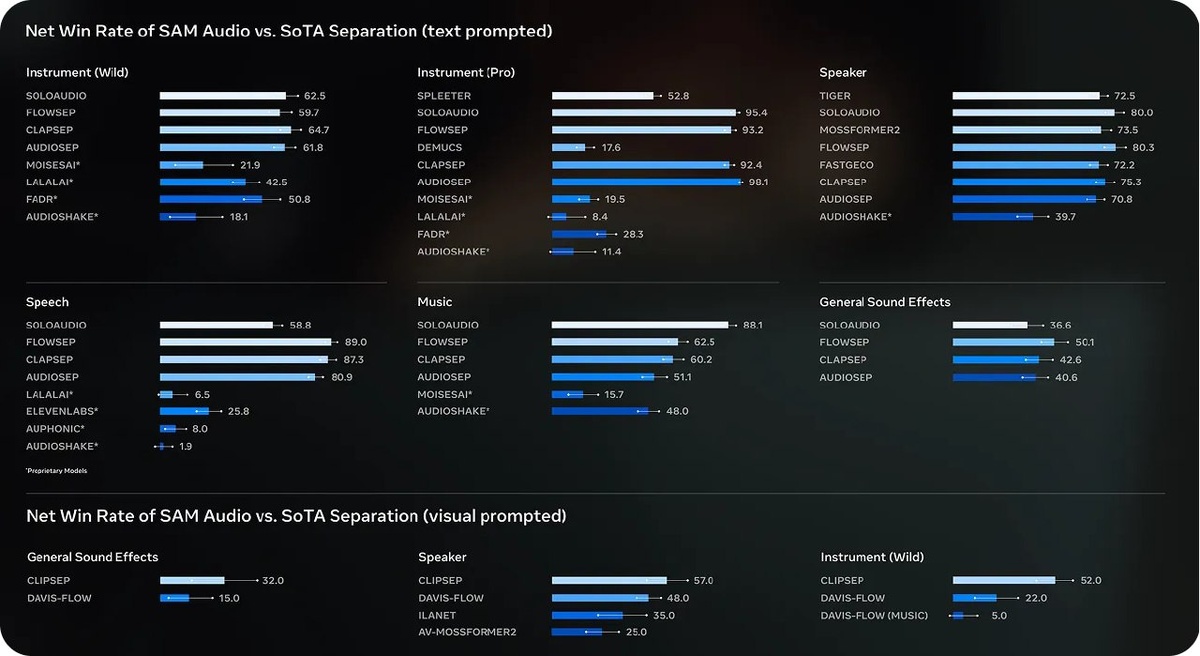 Позволяет извлекать любые звуки из любого аудио или видео источника, используя простые промпты Работает с тремя категориями звуков: Музыка Изолирует инструменты и вокал Речь Извлекает речь из фонового шума, чёткая изоляция говорящего и разделение голосов Общие звуки Отделяет повседневные звуки - от шума трафика до лая собак - из сложных аудио миксов Три типа промптов: - Текстовые промпты - описываете звук словами - Визуальные промпты - кликаете на часть видео, где слышен нужный звук - Временные промпты (span prompts) - выбираете временной отрезок с целевым аудио Использует Flow-matching Diffusion Transformer для генерации высококачественного аудио. Работает в латентном пространстве DAC-VAE. Достигает очень хорошей производительности во всех режимах промптинга. Включает новый Perception Encoder Audio Video (PE-AV), открытую модель с аудио-возможностями Демка GitHub HuggingFace