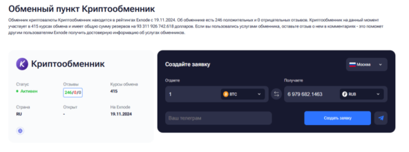 На странице Exnode достаточно нажать на название выбранного обменника и заполнить короткую заявку. В форме указываются направление обмена Биткоин → рубли, город проведения сделки и никнейм в Telegram для связи. Такой формат упрощает процесс и дает ясное понимание, как покупать продавать биткоины без лишних действий и сложных регистраций.