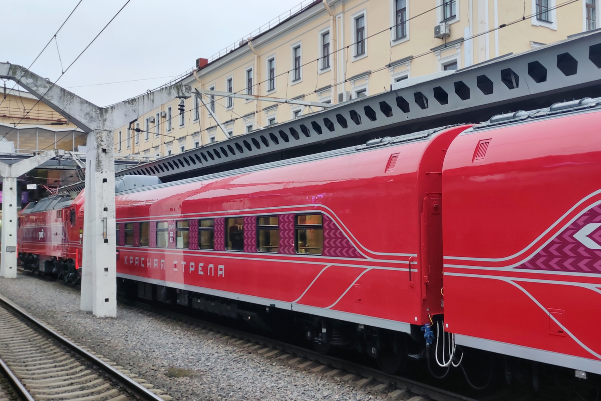 Между Москвой и Петербургом запустили обновленную "Красную Стрелу". Теперь состав поезда комплектуется широкими вагонами габарита Т. Выглядят обновленные вагоны вот так (фото из сети): Это уже восьмое поколение вагонов "Красной стрелы". Ну а я сегодня предлагаю прокатиться на "Красной стреле" предыдущего, седьмого поколения. Поездка состоялась летом 2023 года. Вагоны седьмого поколения были произведены в 2006 году Тверским вагоностроительным заводом и пришли на смену ГДРовским "аммендорфам", которыми "Красная стрела" комплектовалась несколько десятилетий. Делались эти вагоны эксклюзивно под данный поезд и имеют ряд отличий от обычных серийных вагонов. Снаружи это не только «фирменная» ливрея, вагоны имеют гладкие борта без гофр, а также «юбки», закрывающие подвагонное оборудование (но их из-за высоких платформ не видно). Внутри также есть ряд отличий. А вот в качестве ресторана по-прежнему использовался старенький аммендорф: Купейный вагон Красной стрелы седьмого поколения имеет не дев