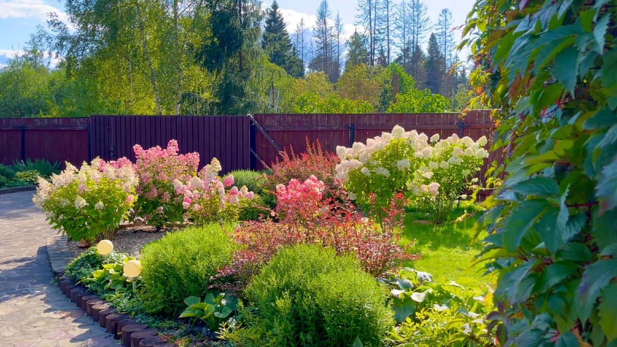 В этой части сада растут еще три гортензии — "Фантом", "Лайм Лайт" и "незнакомка", которую мы формируем на штамбе. Красивым цветением порадовали все. Причем, поначалу я думала, что соцветия будут некрупными, учитывая, что в этом году соцветий значительно больше, как и размеры кустов. Но соцветия к середине августа нарастили приличный объем и уже начали немного розоветь.