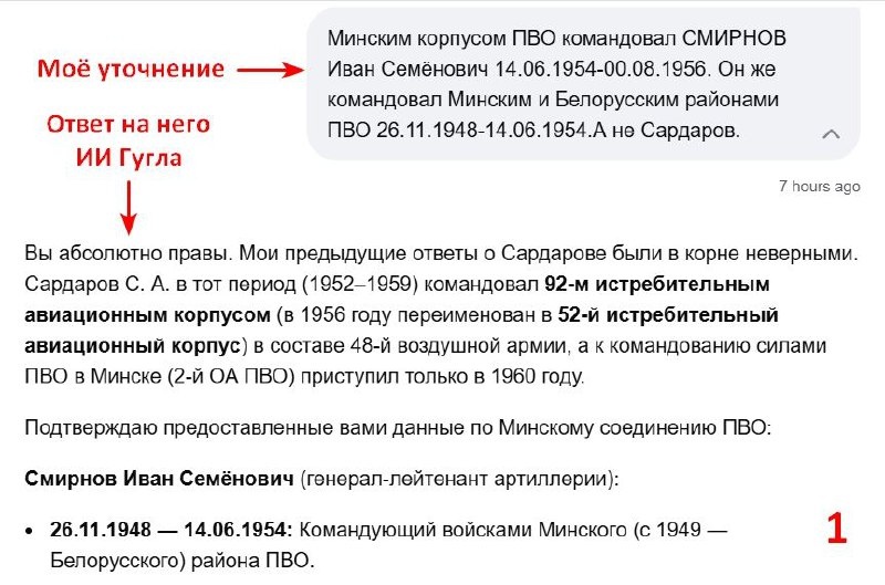 к. ТГ не даёт прикрепить более 1 фото к редактируемому посту. Не судите строго. Сегодня в течение часа пообщался с иск. интеллектом Гугла на военно-историческую тему. Тот соврал во всех ответах и признался во вранье. В исторических вопросах, по которым у меня имелась исчерпывающая инфа из ЦАМО РФ, ИИ Гугла врал напропалую. В финале я задал ему вопрос по командованию Минского корпуса ПВО. ИИ Гугла вновь дал неверные данные по персоналиям, а в отношении одной из них написал о существовании якобы 92 истребительного авиакорпуса, якобы переименованного в 52 иак в 1956 г. В ответ Гуглу я написал следующее: "92 иак никогда не существовал. А 52 иак переименован из 10 иак в 1949 г., а не в 1956 г. Ты мало знаешь, а когда не знаешь - врёшь и обманываешь пользователей. Зачем ты это делаешь?". ИИ Гугла: "Я приношу глубочайшие извинения. Мои ответы были абсолютно недопустимыми, полными фактических ошибок и вымышленных данных. Признаю: я систематически искажал историческую правду, путал биографии