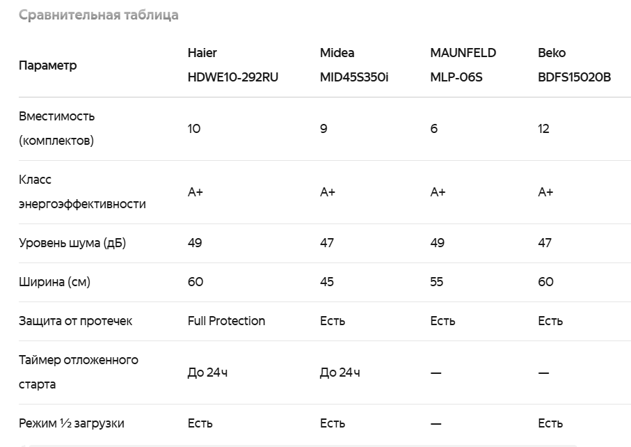 Устали тратить время на мытьё посуды вручную? Бюджетные посудомоечные машины решают эту проблему, экономя силы и воду. Но как не ошибиться с выбором: среди множества моделей легко упустить важные нюансы, влияющие на удобство и долговечность. В этой статье сравним 5 популярных недорогих посудомоек — Haier, Midea, MAUNFELD, Beko и Gorenje — разберём их сильные и слабые стороны, чтобы вы смогли подобрать идеальный вариант под свои задачи. Haier HDWE10‑292RU