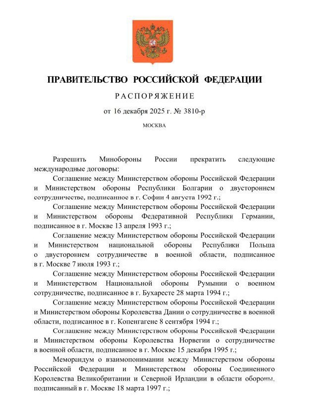 🇷🇺 Министерству обороны РФ разрешили расторгнуть договоры о военном сотрудничестве с рядом стран Европы