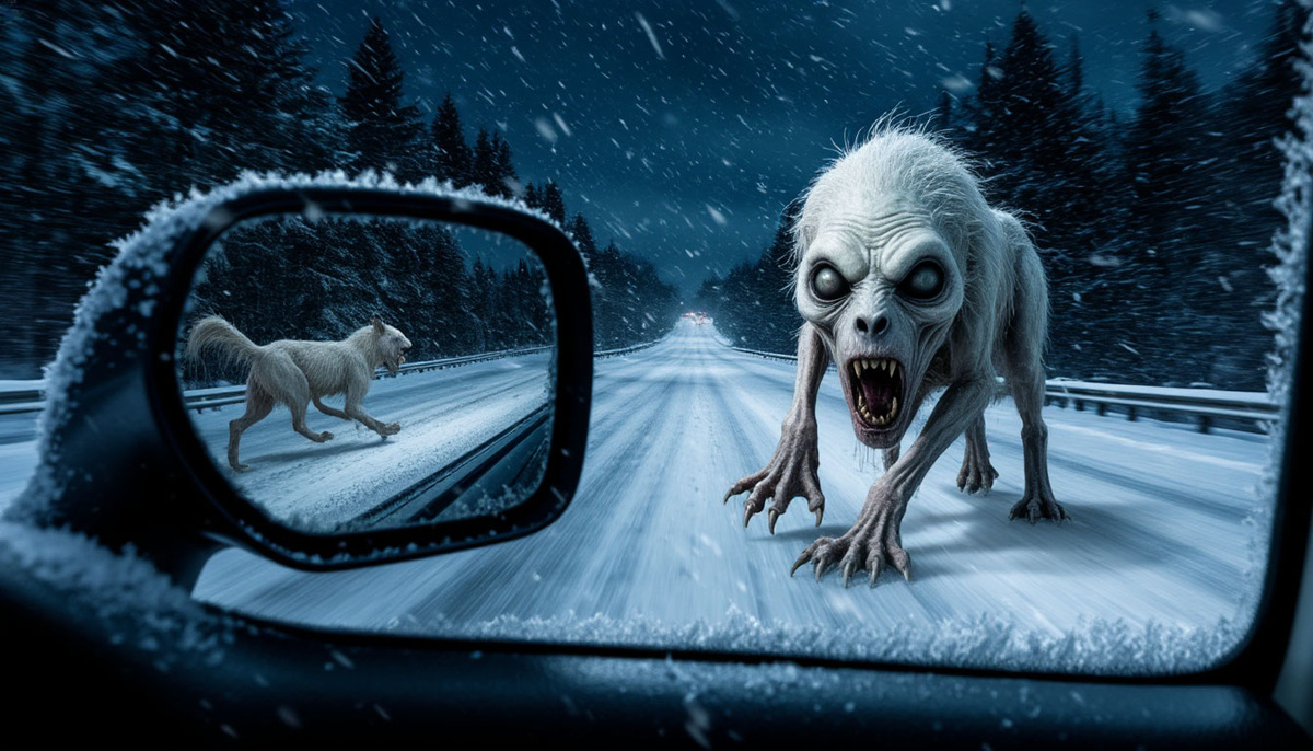 Если ночью на зимней трассе вы заметите в зеркале что-то, что бежит за вами слишком ровно, слишком долго... не вздумайте прибавлять газ. Не кормите его.