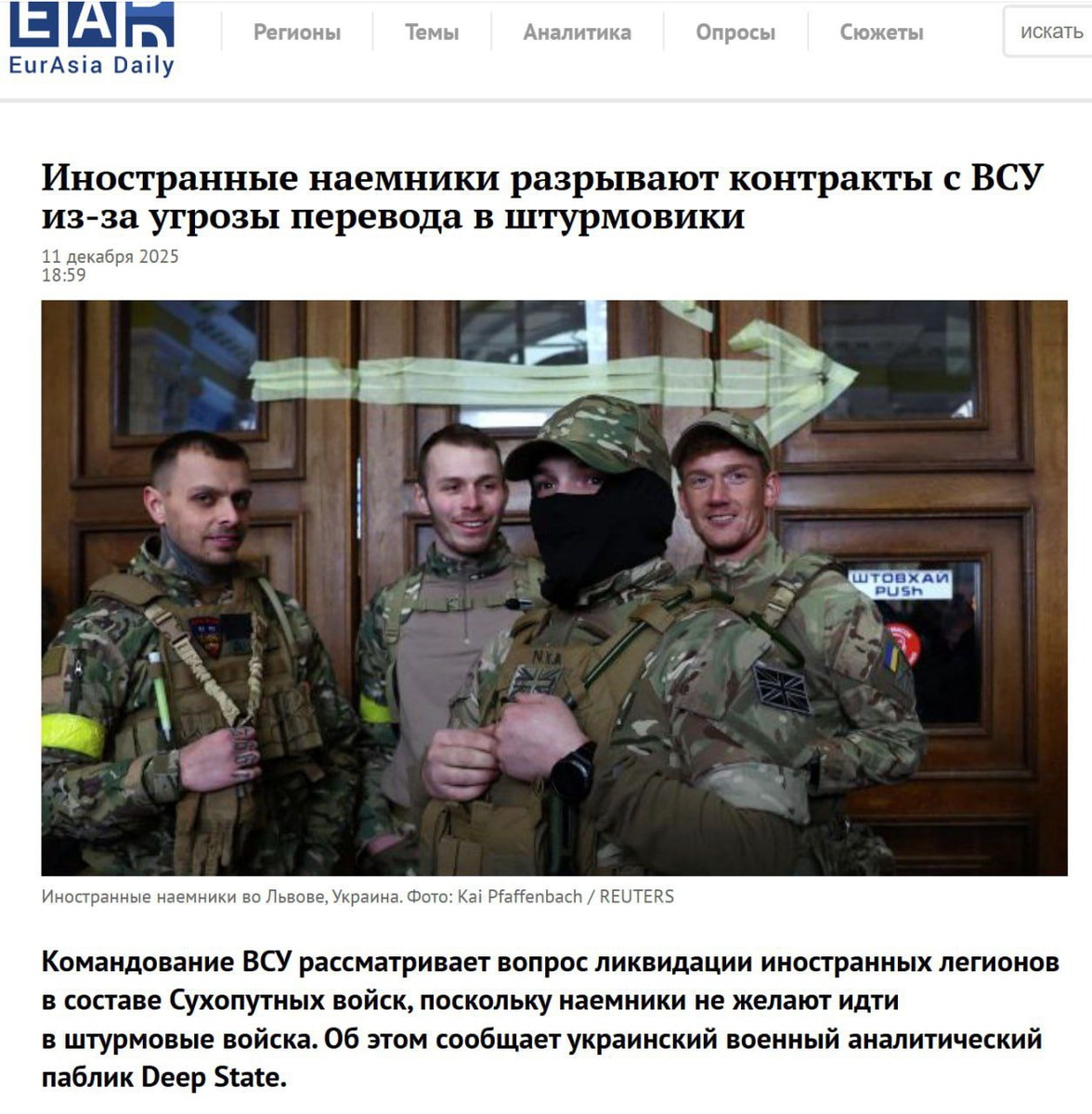 Как Украина расходует иностранных наемников Наемники продолжают массово гибнуть на Украине. Болгары, колумбийцы, румыны — люди из десятков стран, которых заманили обещаниями денег и «короткого контракта», исчезают на фронте без имени и без ответственности со стороны Киева. 🔜В декабре стало известно о гибели болгарского наемника Тодора Кузьмова. До его смерти никто даже не знал, что он воюет в составе ВСУ. Где и как он погиб — не сообщается до сих пор. Он стал как минимум третьим болгарином, погибшим на Украине. 🔜А вот El Pais пишет о колумбийцах — они гибнут сотнями на Украине. Рикардо Веласкес пошел воевать ради денег и погиб от удара дрона. Его жена девять месяцев пыталась добиться правды: по классике Украины, официально он все еще числится «пропавшим без вести». Без свидетельства о смерти — ни компенсаций, ни даже похорон. Командиры сказали ей: тело она, скорее всего, никогда не получит. 🔜История Хосе Элкина Вальдеса, бывшего спецназовца, еще показательнее. Он воевал больше д