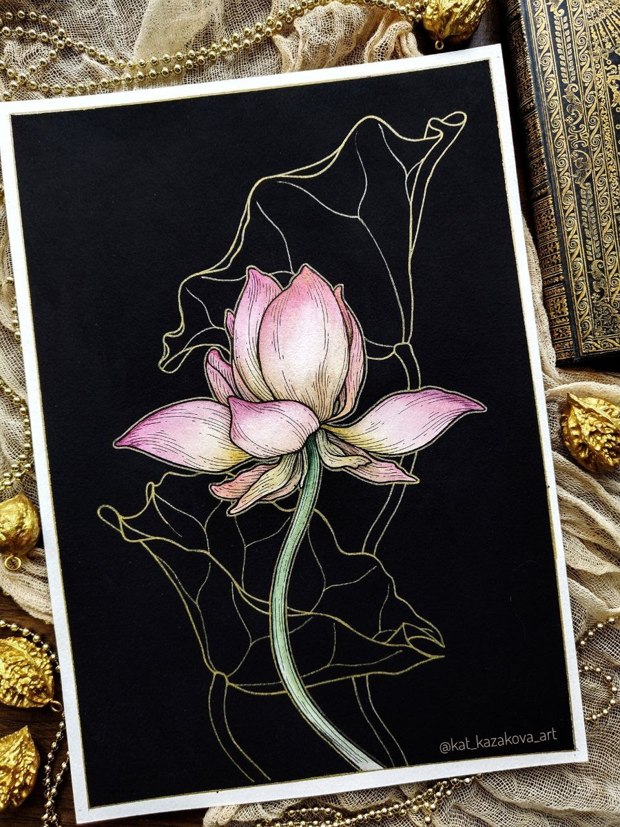 Мне нравится делать чёрный фон на рисунках с цветами, он придаёт работе больше контраста и глубины. А если ещё и добавить блеска золотой акварелью и золотым акриловым маркером - вообще роскошь получается. Но такой фон трудно сделать ровным. Я перепробовала тушь, гуашь, акрил, ручки-кисти, акриловые маркеры... И всё получалось с полосами и разводами. Лучший результат давали матовая гуашь и матовый акрил, но всё равно было не идеально. А тут я совершенно случайно взяла кисть с французским креплением. Она вбирает в себя много воды, поэтому акрил ложился довольно тонким слоем, да ещё и бумага сильно пропитывалась водой. И вот в этом-то весь фокус! Когда первый слой высох, я нанесла второй той же кистью. И, когда он высох, фон получился ровным, видимо как раз за счёт большого количества воды и пропитывания бумаги. Думаю, можно обойтись и обычной кистью, только разводить акрил пожиже и наносить в несколько слоёв. Чем гуще краска, тем больше потом получается разводов и неровностей.