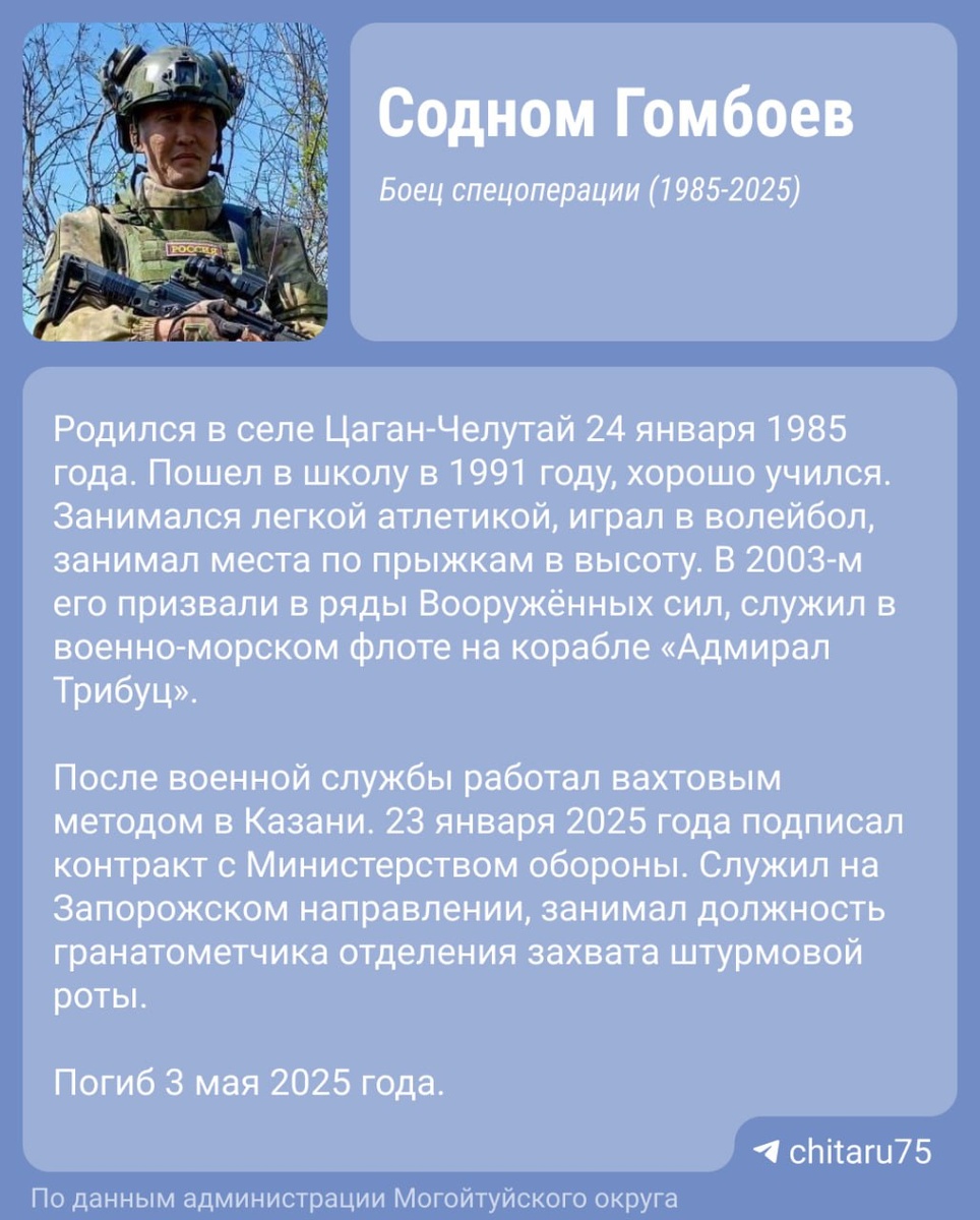В тг-канале администрации Могойтуйского округа пишут, что Содном Гомбоев успел захватить блиндаж противника. У него остались мама, двое младших братьев и сестра. 📌📌📌📌📌 «Чита.Ру» в MAX