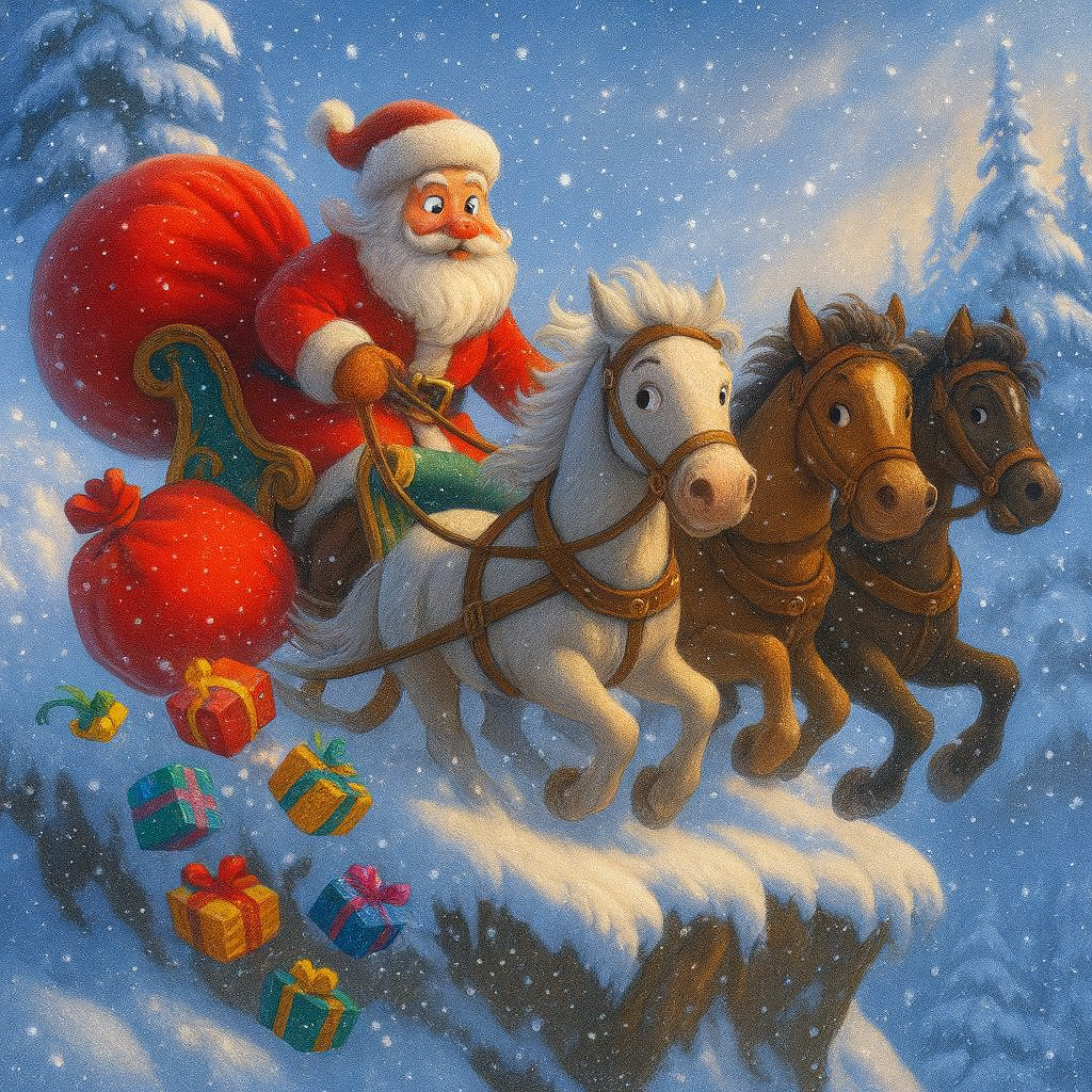 Однако дорога оказалась непростой. Внезапно налетела сильная метель, сбившая коней с пути. Сани резко наклонились над обрывом, и тяжёлый мешок скользнул вниз, рассыпав подарки по всей округе.