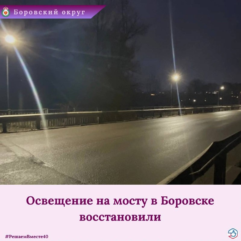 Коммунистической стало светлее По обращениям жителей, которые поступали на платформу #РешаемВместе40, администрация Боровска восстановила освещение на автомобильном мосту. Работы, выполненные подрядчиком, уже завершены. 💡Теперь здесь работают восемь новых светильников, сделав переход и проезд по мосту безопаснее в темноте. 💚 Подписывайтесь на официальный канал администрации в MAX.