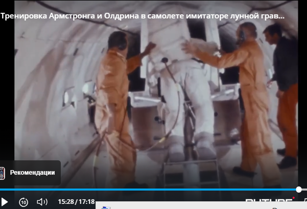 Разумно очередное доказательство отсутствия когда-либо на Луне представителей очень известной страны из-за океана начать с тренировок астронавтов внутри самолета с пониженной гравитацией до примерно 1/6 земной. Актер НАСА Армстронг пытается с лунным весом примерно в 23...25 кГ.