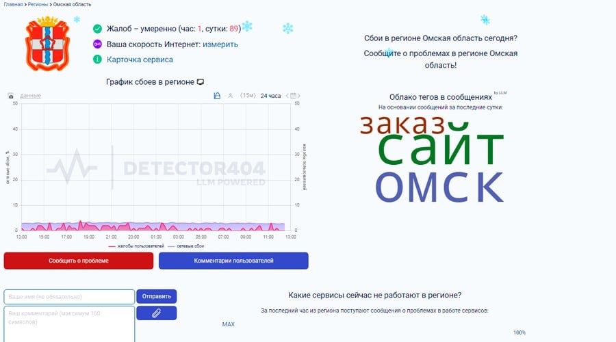 Омичи массово жалуются на проблемы с интернетом Общий сбой в работе интернета наблюдается в Омске. Жалобы поступают от пользователей и мобильного, и домашнего интернета, передаёт «Город55». Кроме того, плохо работают сайты из «белого списка» и мессенджер MAX, сообщает издание. Сервис Downdetector показывает, что 100% жалоб за ближайшее время касаются проблем именно с MAX. До этого также поступали жалобы на работу Gismeteo и Discord. Сайт «Сбои.рф» подтверждает жалобы на MAX. Они поступают из Москвы, Омской области, Красноярского края, Хакасии, Свердловской и Новосибирской областей. 📲 Омичи, напишите нам, как там у вас со связью. Подписаться| Прислать новость| Помочь бустами