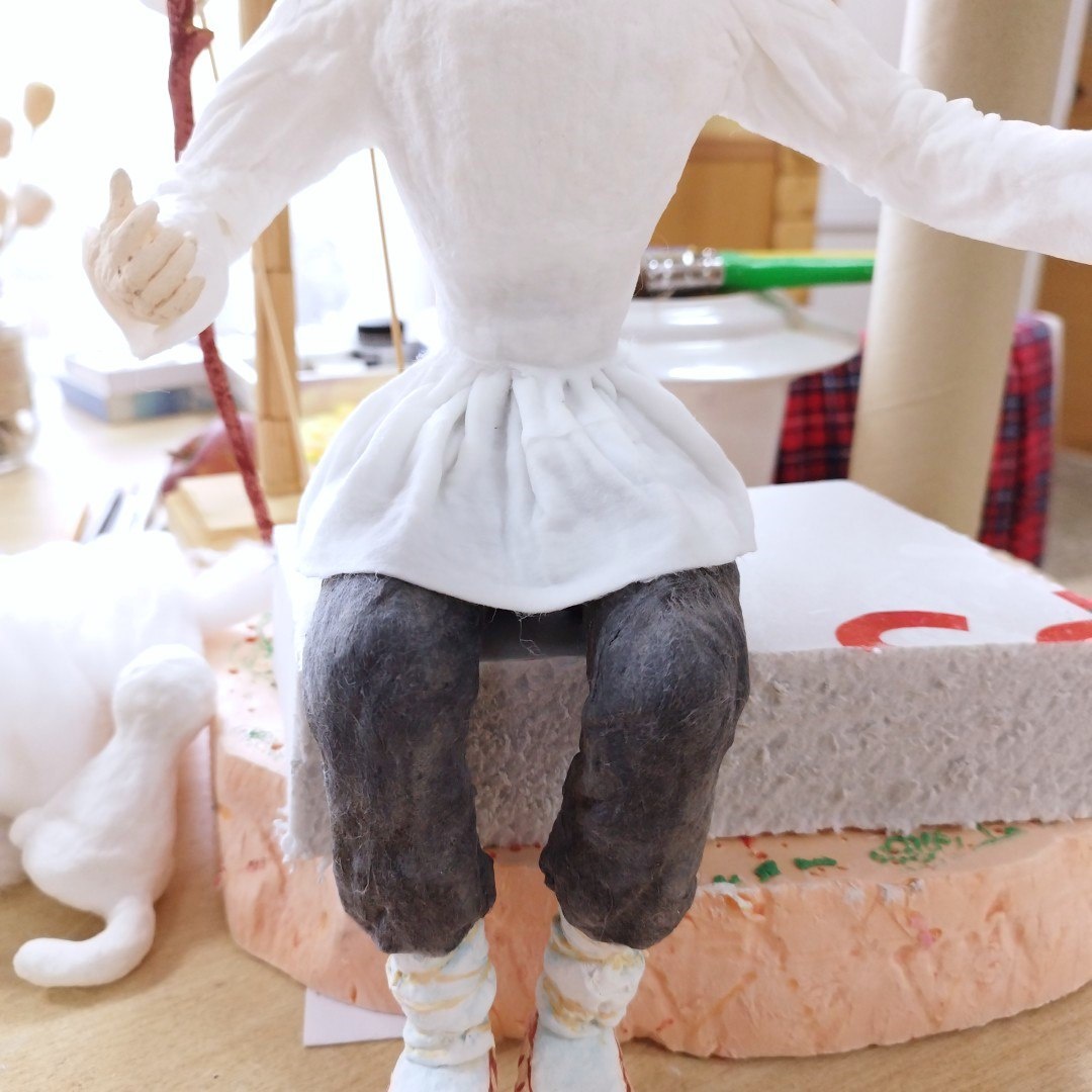 Бабушке «надела» юбку из неокрашенной ваты, позже определюсь с цветом. У нас в Могилевской области в костюмах преобладают синие, красные и темно-коричневые или даже черные цвета, а на рубахах вышивка красными и черными нитями и у каждой области свой орнамент. Но это упрощенный вариант и тут главное показать быт белорусских деревень Вырезала из ватного полотна косынку и фартук, надо покрыть их белой акриловой краской и за тонировать.