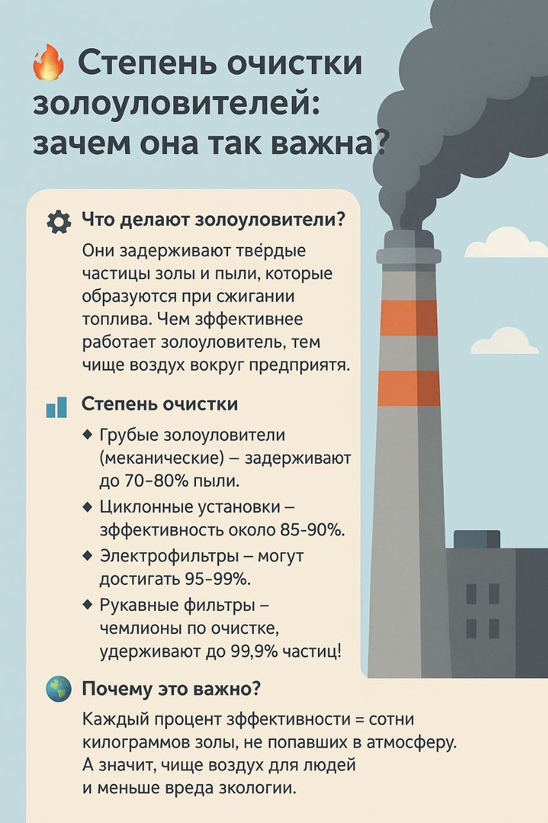 Они задерживают твёрдые частицы золы и пыли, которые образуются при сжигании топлива. Чем эффективнее работает золоуловитель, тем чище воздух вокруг предприятия.