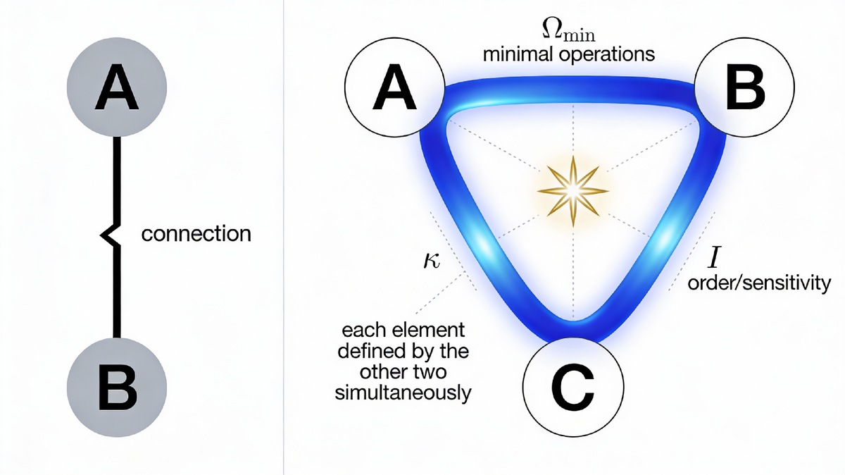 Однако в трёхполярности центральная операция не является парной. Здесь смысл не «происходит» между A и B отдельно. Смысл возникает в связке, где каждый элемент определён через два других одновременно. Ленский выражает эту идею в форме взаимной определённости: A = B•C, B = A•C, C = A•B, а вся связка фиксируется через общий якорь единства A•B•C = ☼. Мне важно не механически переносить эту символику в арифметику, а удержать инженерный смысл: не существует корректного вывода, если я разорвал триаду и оставил только пары.
