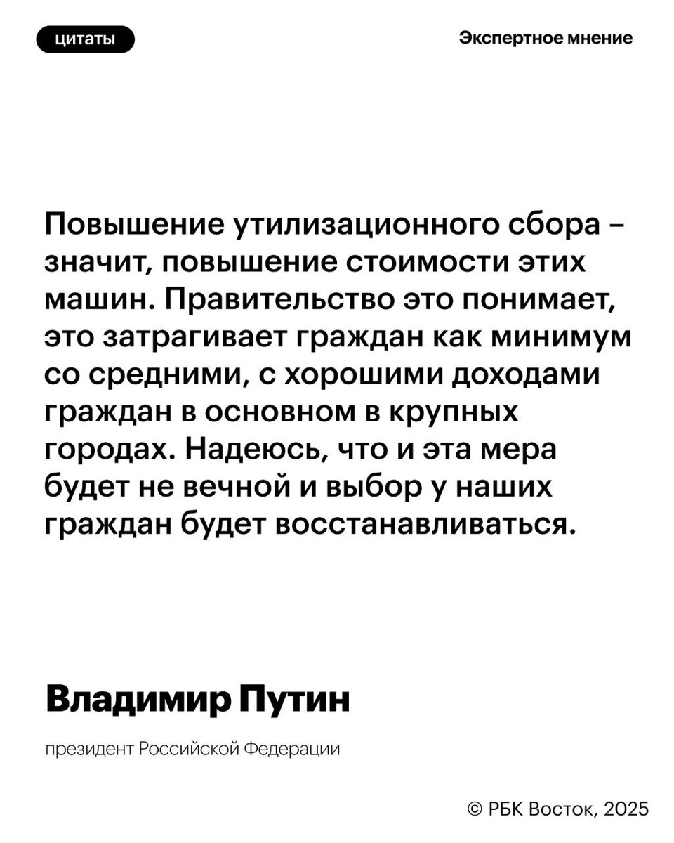 Глава государства впервые прокомментировал повышение «утиля» и изменение механизма его расчета, назвав процесс временным Президент отметил, что в основном повышение утилизационного сбора затронет граждан как минимум со средними доходами и в основном в крупных городах. 🔗 РБК Восток в Telegram и MAX