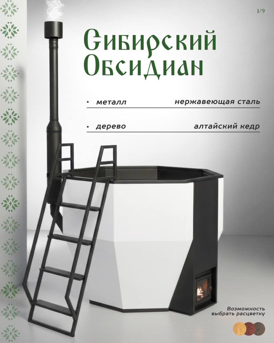 🌿 Произведение искусства для вас. Наша новинка — это слияние роскоши, утончённой эстетики и безмятежного комфорта. Для тех, кто ценит глубокий отдых и получает истинное наслаждение от красоты. Есть возможность выбрать цвет, подходящий именно вам: • Нержавеющая сталь — вечная классика • Северный белый — чистота и стиль • Вулканический черный — драма и глубина • Бордовый закат — страсть и уют ▪Основа стиля и надежности — металл: • Чаша — восьмигранная 1800х1450 мм. • Сливная система — труба и кран • Печь: удлиненная/ стандартная погружная • Составной дымоход, с сэндвич-трубой для защиты от ожогов • Приставная лестница Металл — нержавеющая сталь AISI 430/304 — гарантия надёжности на десятилетия. Это не покупка, а разумная инвестиция в ваше удовольствие и комфорт. ▪Тепло и комфорт — дерево: • Спинки по кругу • Сиденья • Подножник • Ступени лестницы Дерево — алтайский кедр — его природная стойкость к влаге и грибку защитит ваш банный чан от времени, а выделение фитонцидов — ваше здоро