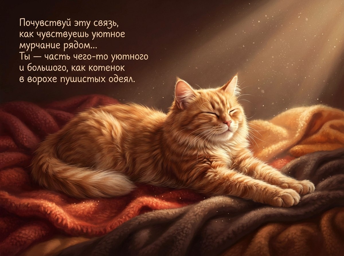Пробуждайся медленно, словно твой внутренний котик, который сладко потягивается в первом солнечном луче, упавшем на подушку. Сегодня мир отмечает День солидарности, и это тихий шепот Вселенной о том, что мы все связаны незримыми теплыми нитями. Почувствуй эту связь, как чувствуешь уютное мурчание рядом, даже если в комнате тихо. Позволь себе сегодня быть мягким, принимать поддержку и дарить ее в ответ одним лишь теплым взглядом. Ты не одинок в этом огромном мире, ты — часть чего-то уютного и большого, как котенок в ворохе пушистых одеял. Пусть твое сердце сегодня мурлычет от ощущения единства, спокойствия и нежности. Этот день принадлежит тебе, наполни его тихим светом и внутренней гармонией.