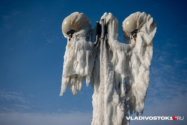 Громадные ледяные фигуры «обнимают» набережную ТОФ — так происходит каждую зиму, когда пронзительный ветер заставляет холодное море на целый
