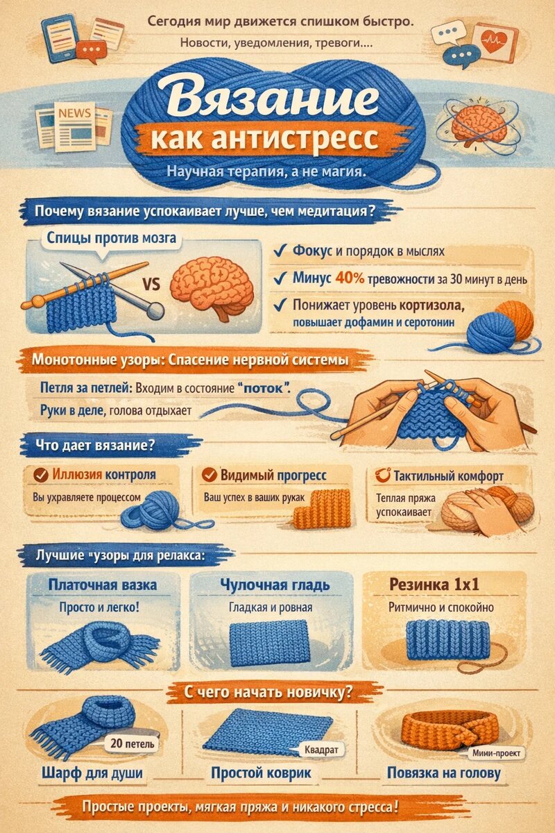 Спицы против мозга: когда вы вяжете, ваш мозг получает четкую работу. В отличие от медитации, где нужно "не думать о плохом" (что само по себе стресс), вязание дает вам фокус. Петля за петлей, столбик за столбиком — ваши руки заняты, мысли организуются, хаос внутри начинает укладываться в ряды.