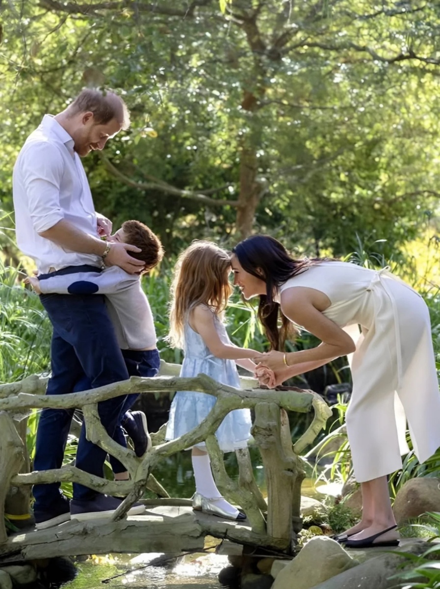Открытка прекрасна, на ней такие очаровательные сцены любви между родителями и их детьми, которые сняты естественно, без всякого позирования, от чего так эмоциональны и трогательны. Шестилетний Арчи крепко держится за своего отца, пытаясь на нём повиснуть. Видно, что он похож на него, и цвет волос такой же, как у Гарри, с рыжеватым оттенком. Меган держится за руки с четырёхлетней Лилибет, мило улыбаясь ей. По прежним фотографиям известно, что Лилибет тоже очень похожа на своего отца. Такая нарядная девочка в голубом жаккардовом платье, белых гольфах и золотистых туфельках с чёрным лакированным носом.