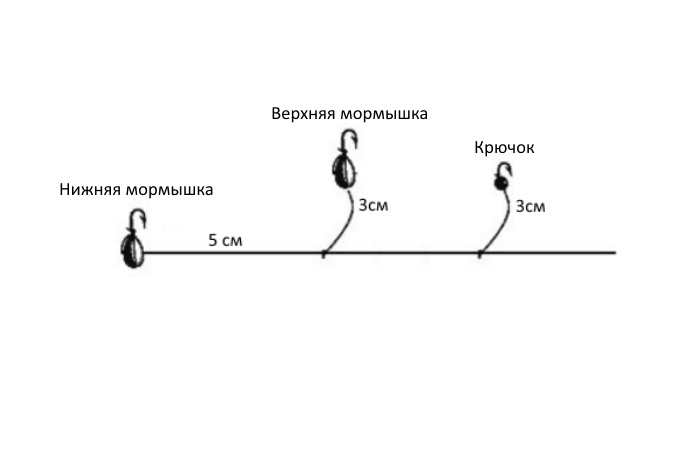 Конструкция данной оснастки достаточно проста, но при этом весьма эффективна. К концу основной лески привязывается не одна, а сразу две мормышки, расстояние между которыми составляет примерно пятьдесят-семьдесят миллиметров. Непосредственно выше мормышек крепится дополнительный крючок, как правило, третьего номера. Чтобы избежать запутывания поводков, их длина делается небольшой - около тридцати-сорока миллиметров. Подобное решение преследует сразу две важные цели. Во-первых, появляется возможность одновременного использования различных насадок, что значительно увеличивает шансы на поклевку. Во-вторых, общий вес оснастки увеличивается, благодаря чему она гораздо быстрее погружается на необходимую глубину, экономя драгоценное время рыболова.