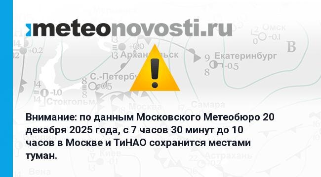 Внимание: по данным Московского Метеобюро 20 декабря 2025 года, с 7 часов 30 минут до 10 часов в Москве и ТиНАО сохранится местами туман.