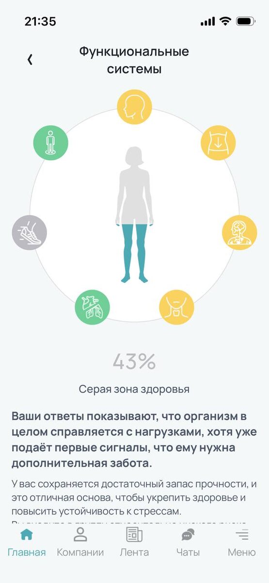 Ну я и так догадывалась, не зря месяц назад пошла к психологу. Вот скриншоты, сами посудите. Да, психологи, первые кандидаты на стресс, поэтому нам нужно очень тщательно соблюдать ментальную гигиену, восстанавливаться и отдыхать. А не загонять себя ещё сильнее. Приложение выдало мне анализ моего состояния. Функциональные системы 43% упс! Организм в целом справляется с нагрузками, хотя уже подаёт первые сигналы, что ему нужна дополнительная забота. Выделило систему оздоровления через снижение хронического стресса. Дало рекомендации по стрессу, питанию, движению и витаминам. Всё буду делать, как отличница, не хочу опять в выгорание свалиться! Но сказало: если своевременно принять меры, всё будет хорошо. Это утешает. Общая диагностика по разным сферам показала жёлтую зону (приложу скриншот), достаточно низкий показатель, надо прям срочно позаботиться о себе. А то последний год у меня фокус внимания был на другом. Я так думала: куплю коллагенчик и всё будет ок. А оно мне показало: фа