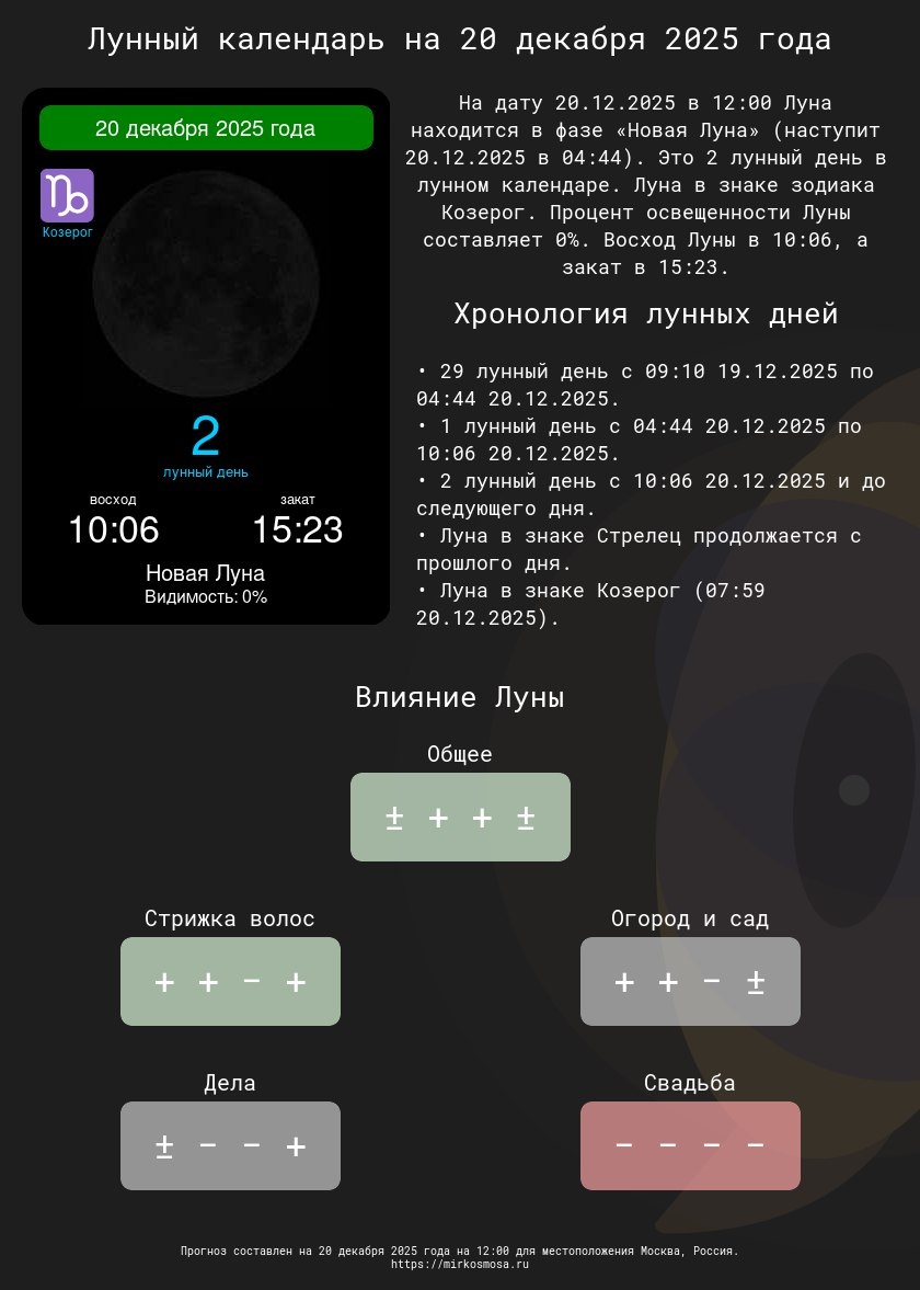 ! 🔹🌗 Лунный календарь на 20 декабря 2025 года — Что приготовила Луна? Подробнее 🔹✂️ Лунный календарь стрижек на 20 декабря 2025 года — Подходящий ли день для обновления прически? Подробнее 🔹🌱 Лунный календарь огородника и садовода на 20 декабря 2025 года — Лучшее время для ухода за растениями. Подробнее 🔹📅 Лунный календарь дел на 20 декабря 2025 года — Удачные моменты для важных задач. Подробнее 🔹💍 Лунный календарь свадеб на 20 декабря 2025 года — Подходит ли этот день для вашего торжества? Подробнее