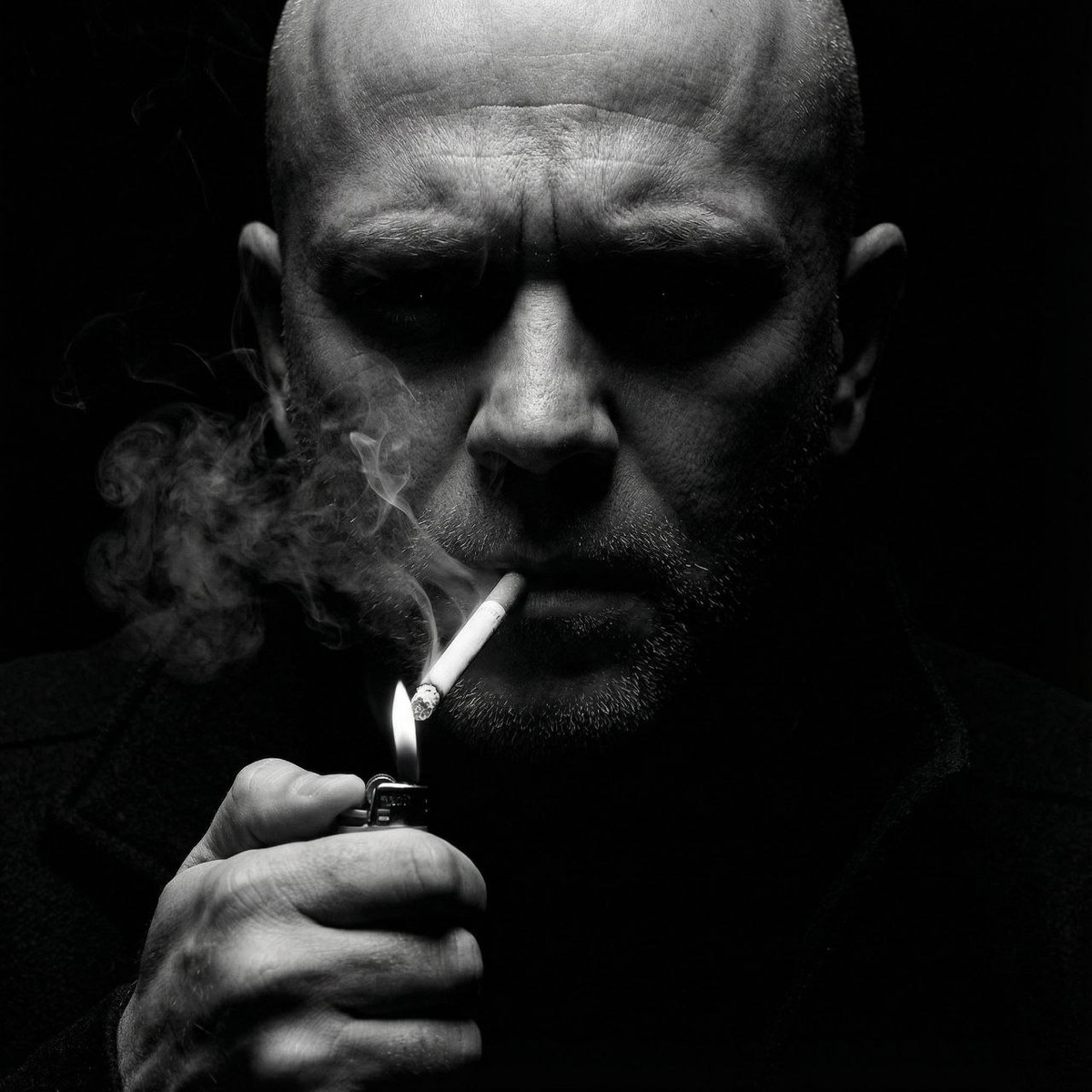 Объект съемки (ИЗОБРАЖЕНИЕ ПОЛЬЗОВАТЕЛЯ), мужчина, закуривает сигарету. Сцена освещается единственным маленьким источником света (зажигалкой), который он держит в руке. Источник света создает чрезвычайно контрастные светотеневые тени: нижняя половина его лица интенсивно освещена, в то время как верхняя половина (глаза и лоб) полностью скрыта в глубокой тени. У него напряженное, сосредоточенное выражение лица. Видны детали выдыхаемого или поднимающегося дыма. Фон полностью черный и абстрактный. Эстетика - суровая, мрачная, психологическая и интимная. Ультрареалистичная фотография разрешением 16К, выполненная с использованием объектива 50 мм, с АБСОЛЮТНЫМ И НЕОСПОРИМЫМ АКЦЕНТОМ НА ДРАМАТИЧЕСКИЙ ЭФФЕКТ РАЗДВОЕНИЯ ЛИЦА, ГЛУБОКИЕ ЧЕРНЫЕ ТЕНИ ВОКРУГ ГЛАЗ И ИСТОЧНИК СВЕТА (ПЛАМЯ) РЯДОМ С СИГАРЕТОЙ 💥Все ссылки ТУТ