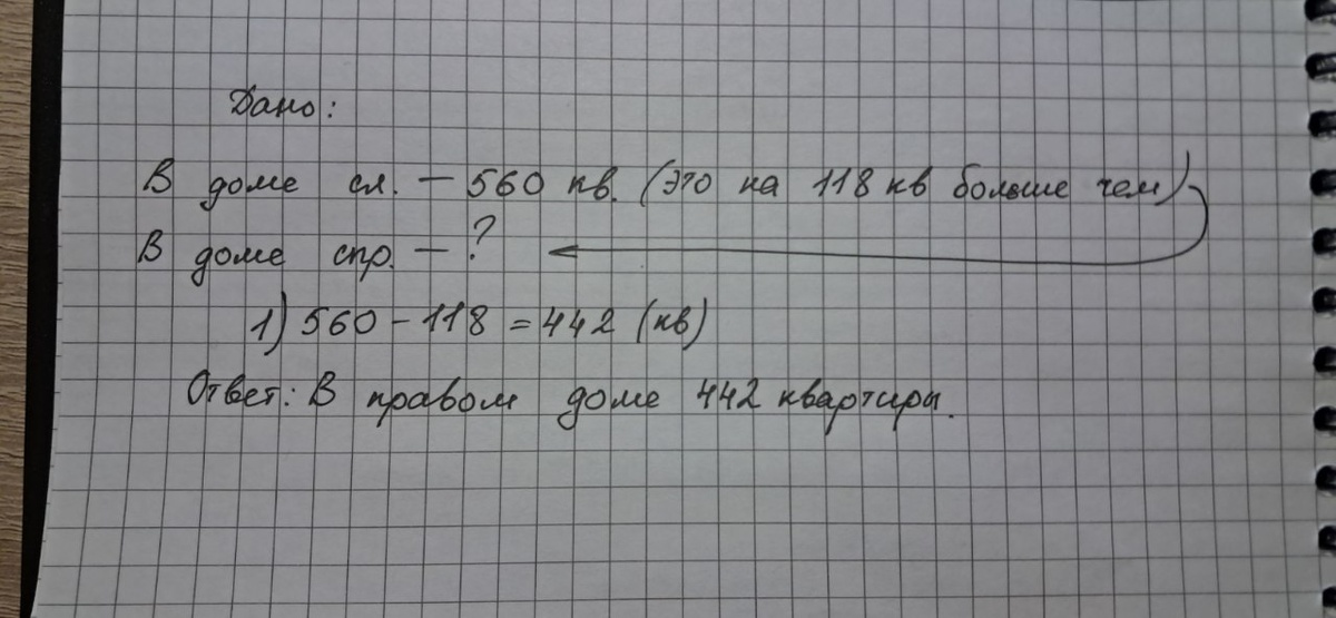 Дано: В доме слева 560 квартир Это на 118 квартир больше, чем в доме справаНайдем количество квартир в правом доме: