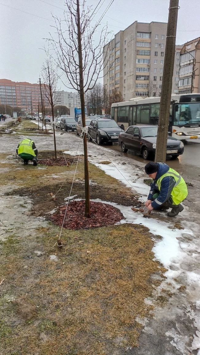 Молодые саженцы, наклонившиеся от ветра, снега и других причин, закрепляют растяжками, пока земля оттаяла.