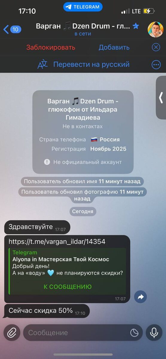 : Наш официальный аккаунт этот и там фиолетовый аватар: 👉@ildar_vargan_workshop 👈 @vargan_dzendrum_shopbot Скидок 50% мы не делаем, если что. Также можно писать прямо в наш канал и задавать вопросы, если происходят такие сообщения. По ссылкам как на скрине не переходите. В итоге мы приняли доп меры безопасности. Комментировать могут только участники и после вступления. Всех участников мы скрыли, чтобы их нельзя было перенести в какую-либо базу. Вместе мы команда, очень рады, что среди наших подписчиков есть бдительные люди и что даете обратную связь. Команда, Твой Космос.